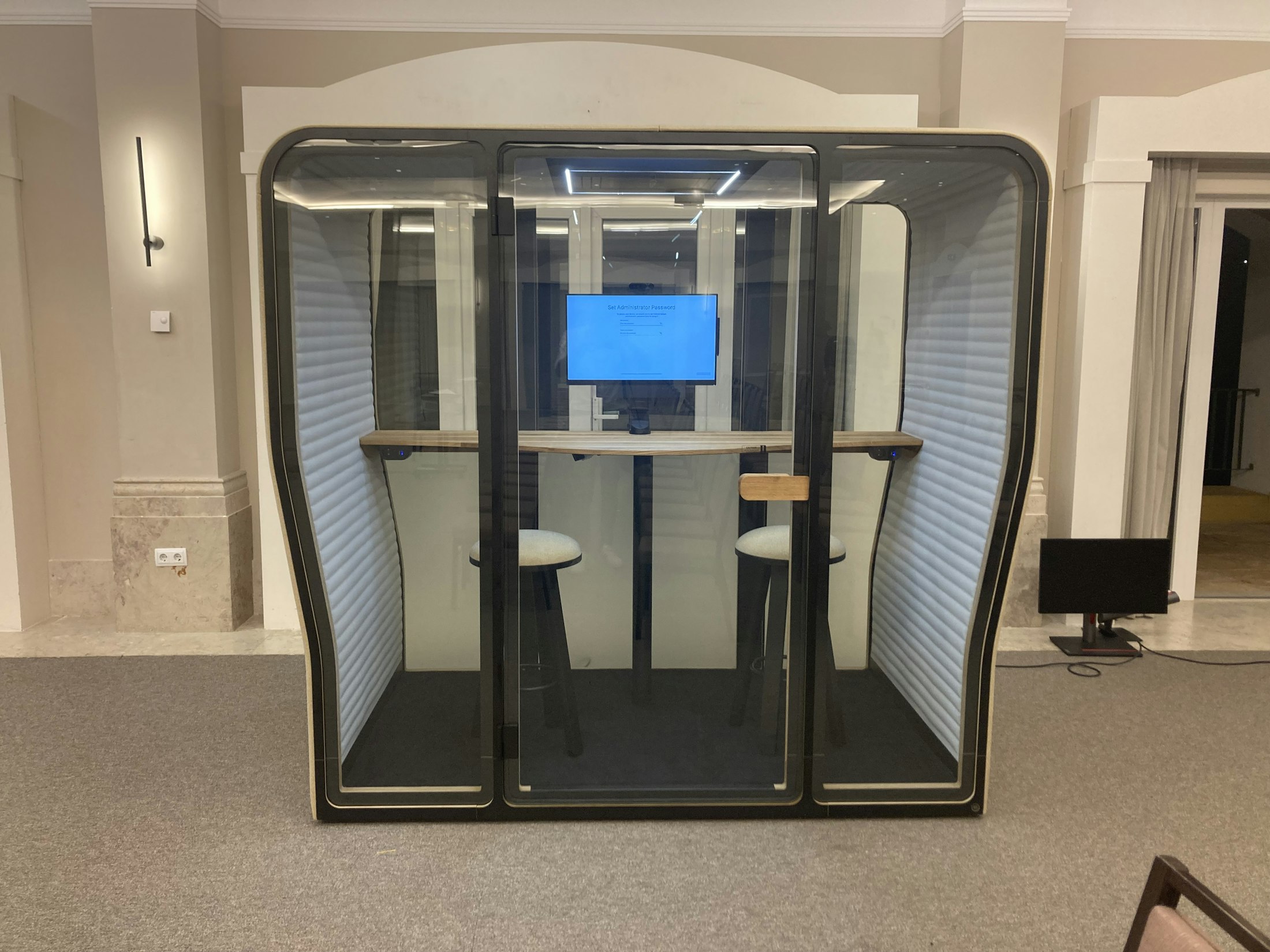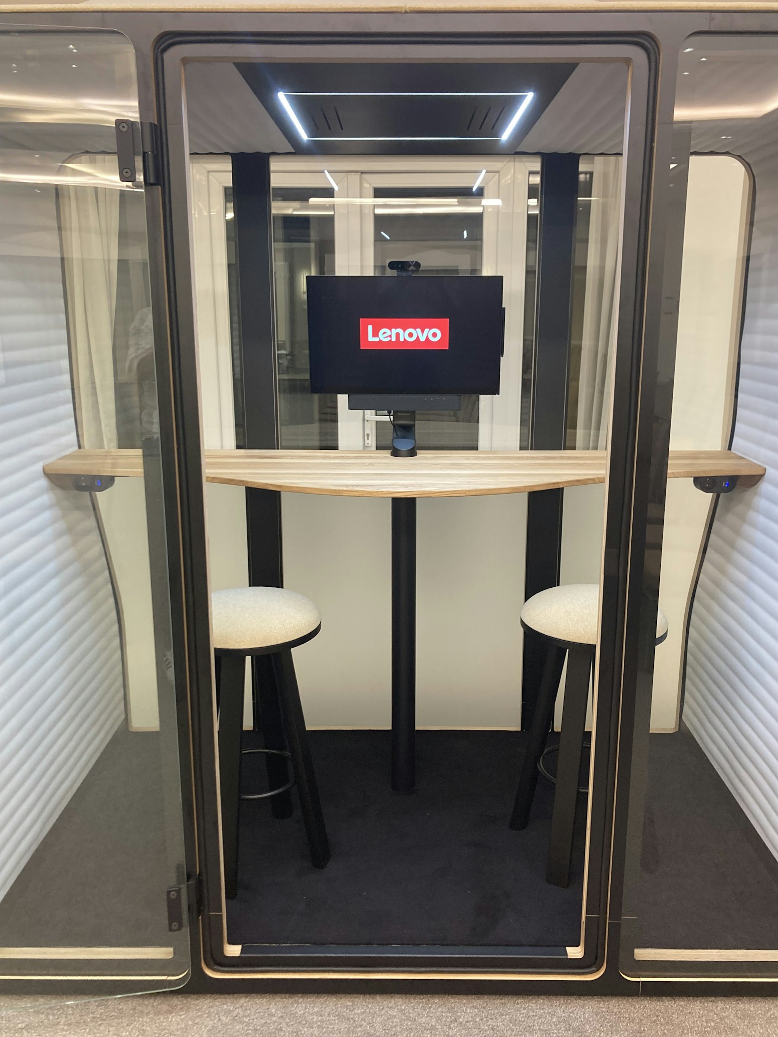 The BuzziNest Smart solution is a private environment integrated with Lenovo collaboration technology, creating a phone booth for one person, a small private office, or a meeting space for two for video collaboration on Teams.