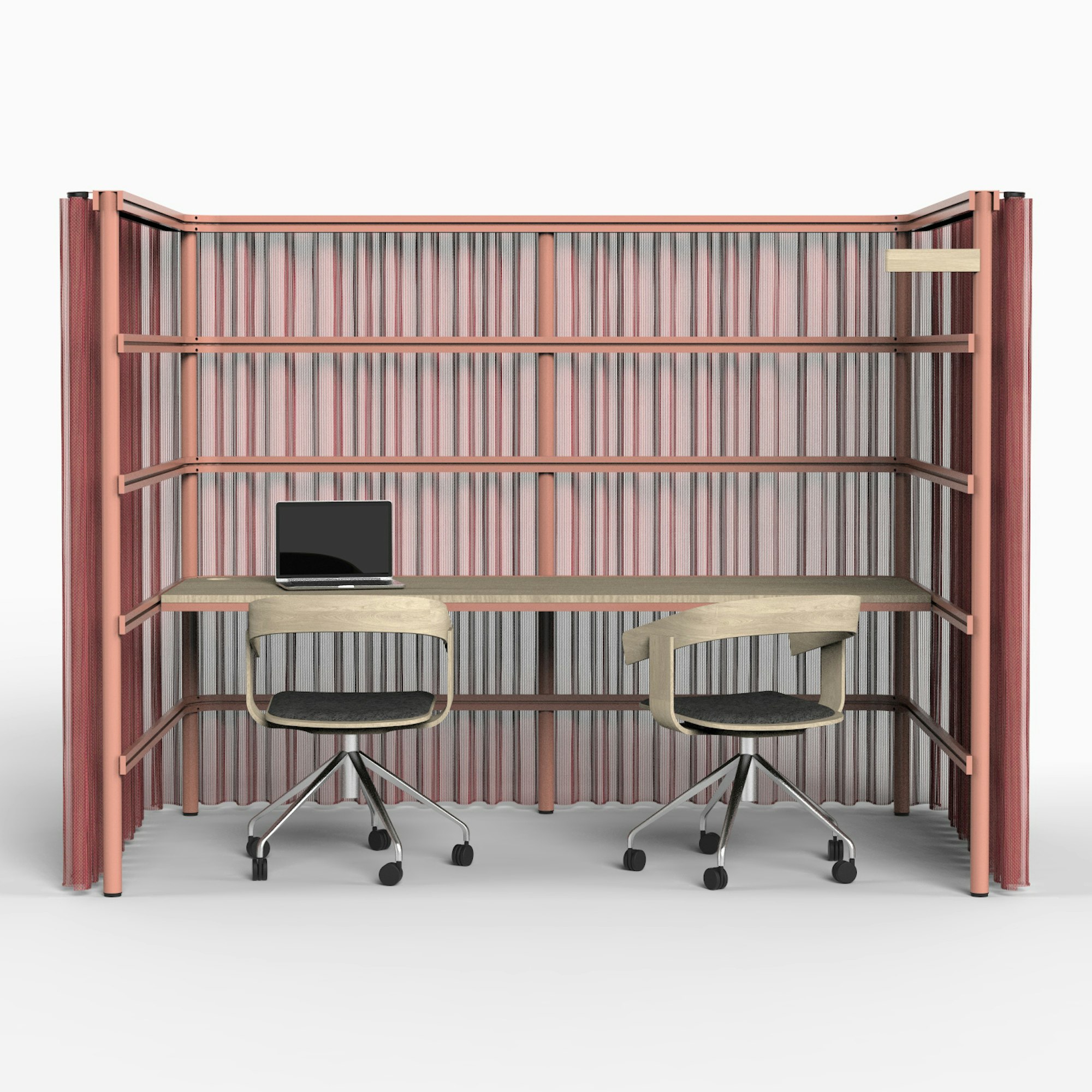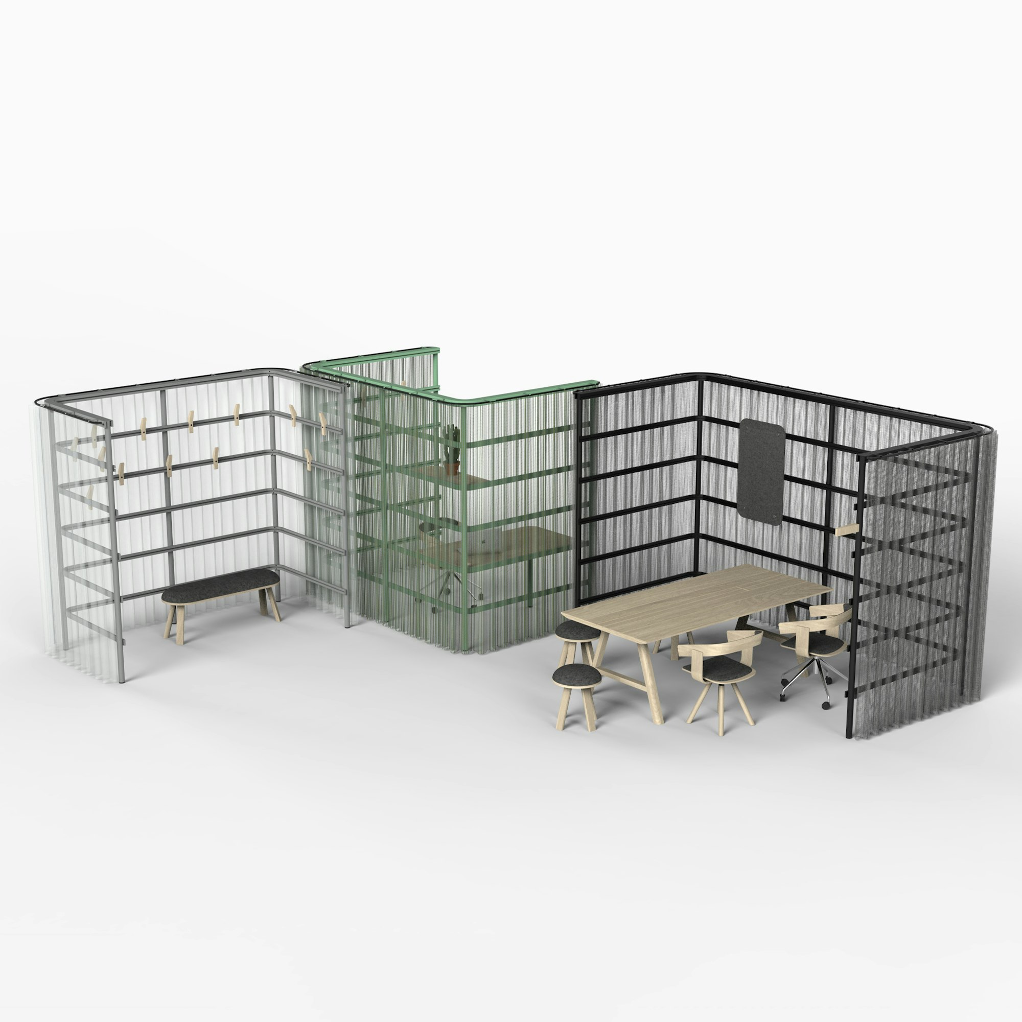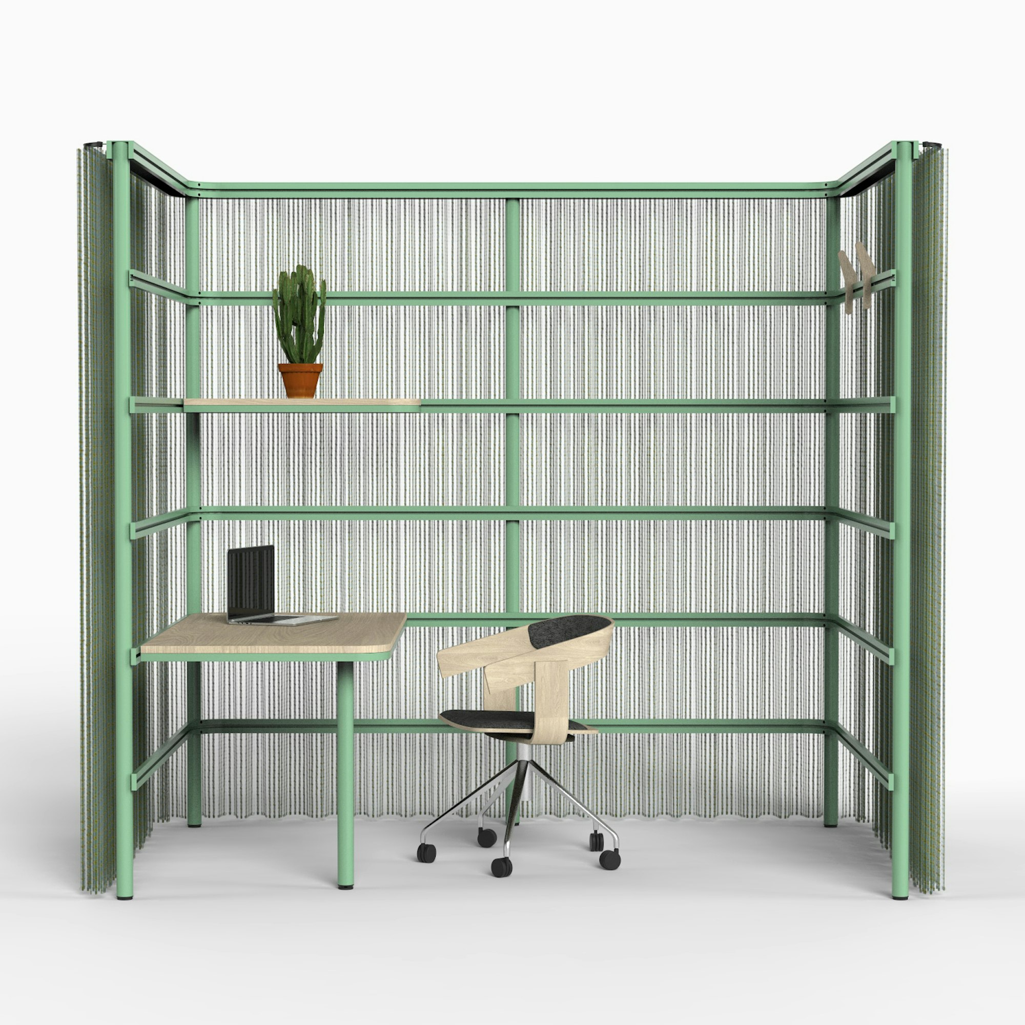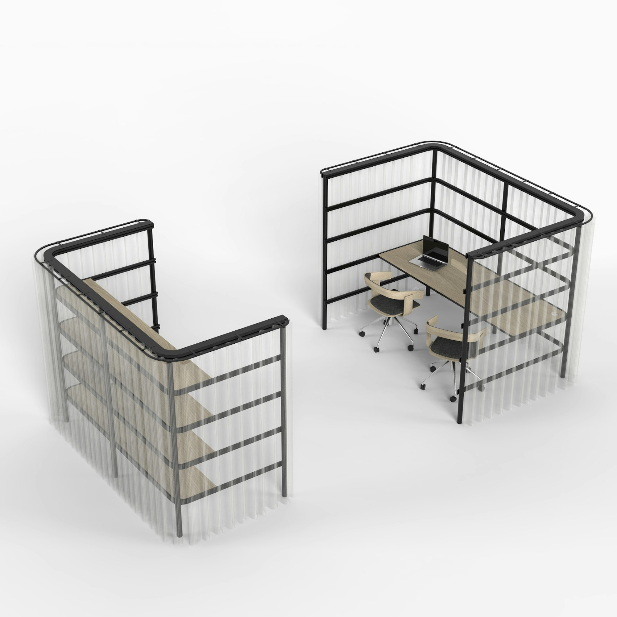 BuzziBracks accommodates the need for flexibility and different ways of working in a great way. This lightweight modular unit system provides you with the possibility to create a variety of setups within an existing area. Handy for quick meetings or some focused work. The drapery adds softness to the aluminum frame while providing a visual and acoustic shield to avoid distractions and still stay connected with co-workers.