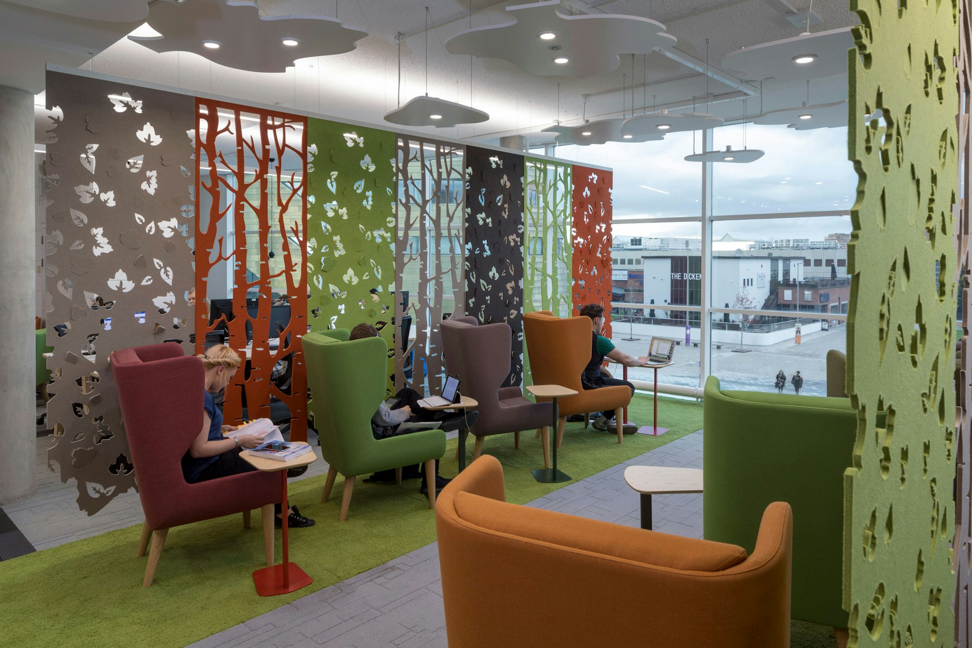 Da die Geräuschübertragung eines der Hauptanliegen ist, suchte die Teesside University nach Akustikprodukten, die übermäßigen Lärm absorbieren, damit sich die Studenten konzentrieren können, und die gleichzeitig die Ästhetik der zahlreichen Bibliotheksräume verbessern.