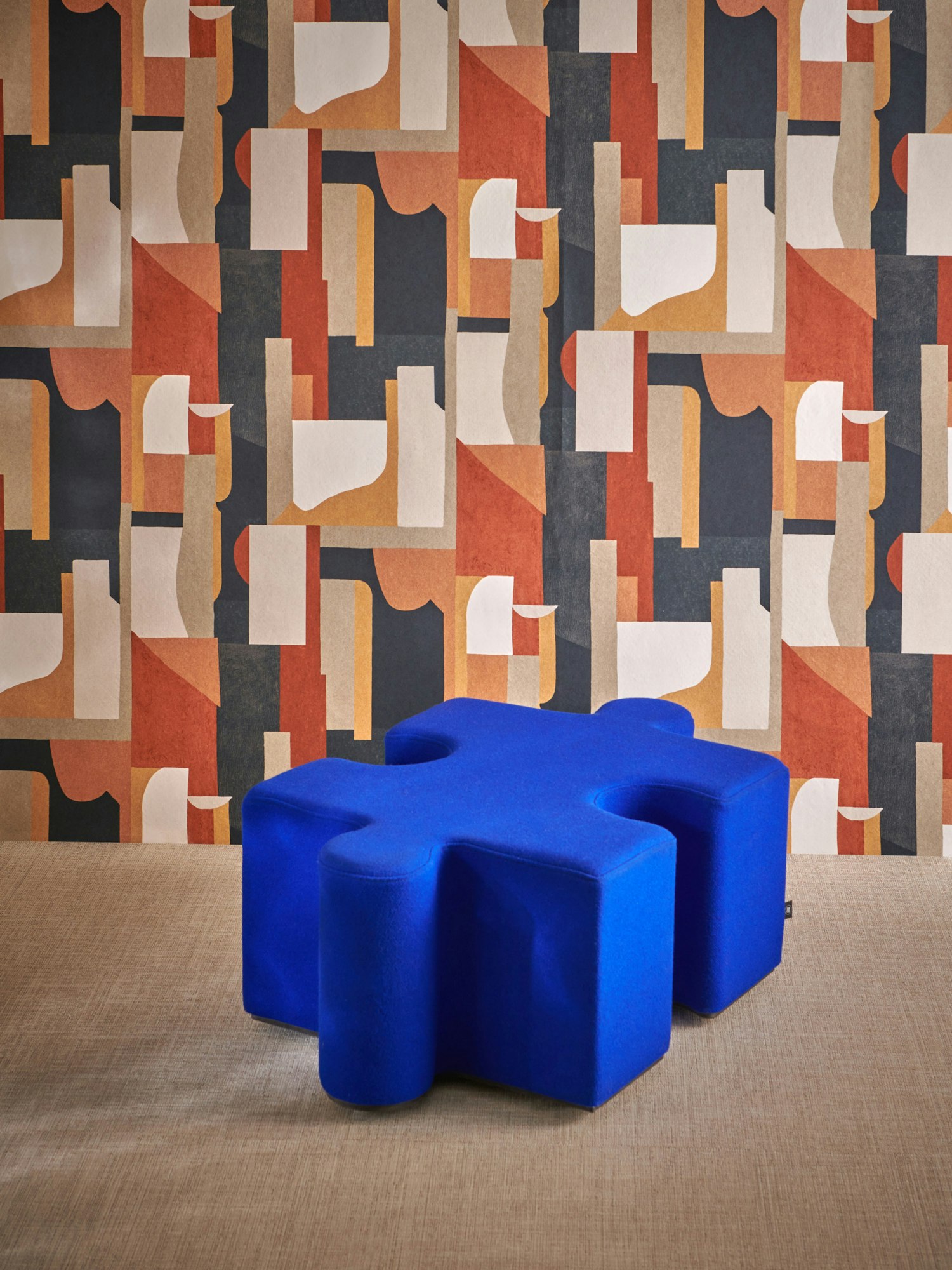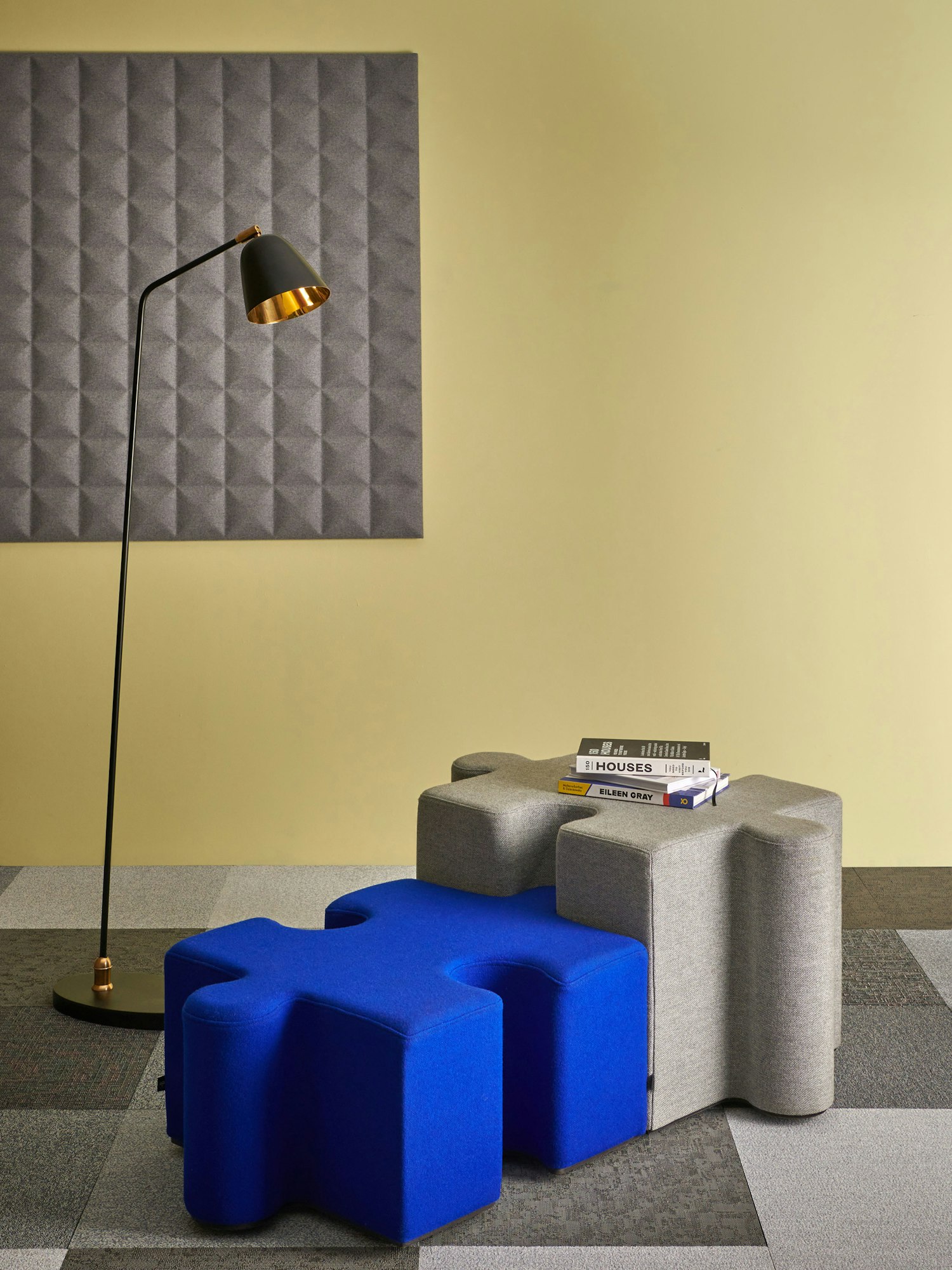 Auf dem obigen Bild zu sehen: BuzziTile 3D - 25 Square in Fabric Light Grey; BuzziPuzzle Low in Tonus 4 - 631; BuzziPuzzle High in Trevira CS - Ash.