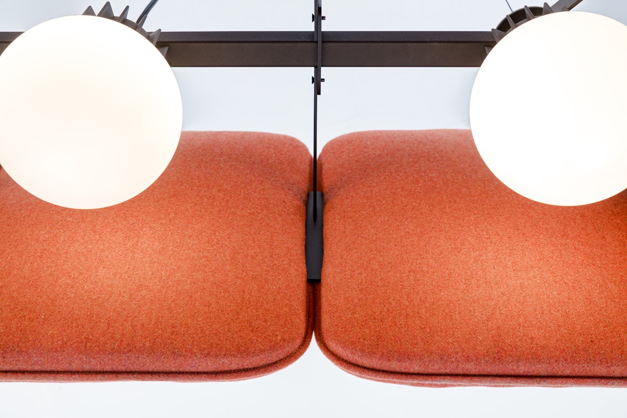 Nos solutions d'éclairage acoustique BuzziPleat Light et BuzziJet créent un espace accueillant pour les clients et les employés de l'hôtel.