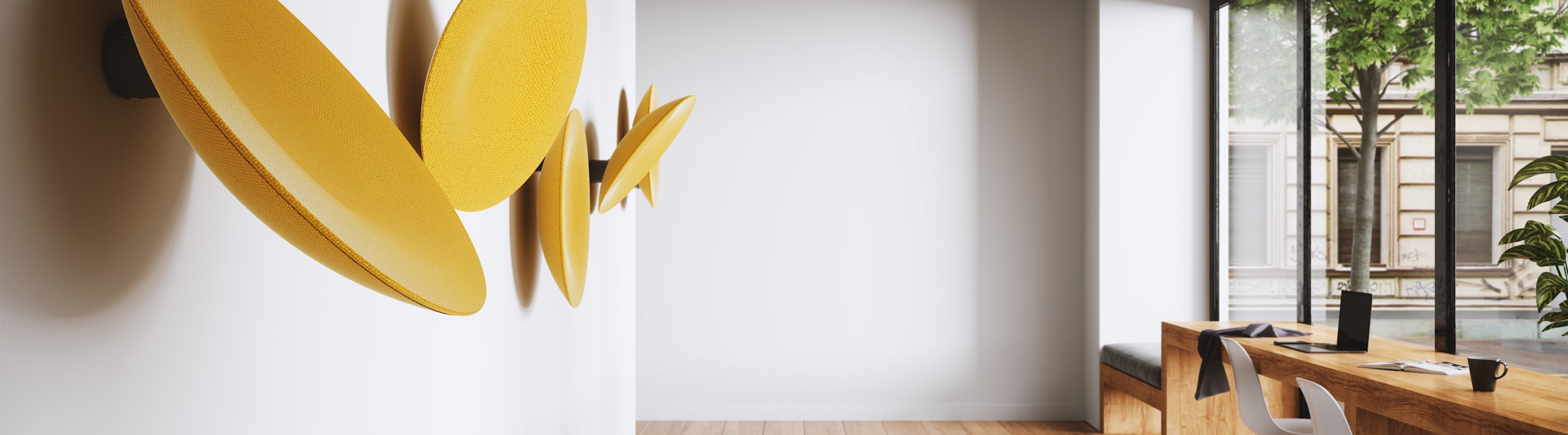 Extérieur ludique, intérieur complexe. Ce traitement acoustique haute performance des murs et des plafonds allie design et fonctionnalité grâce à sa forme reconnaissable, qui rappelle celle d'une antenne parabolique.