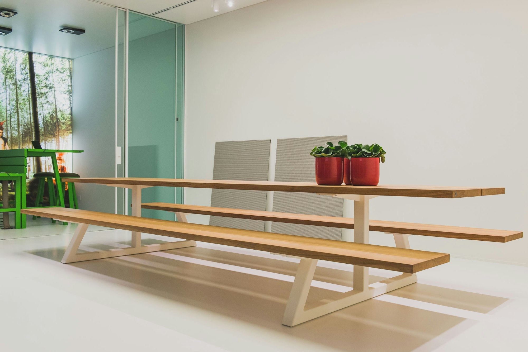 La table BuzziPicNic est un autre moyen de créer une atmosphère extérieure à l'intérieur. La gamme comprend une variété de formes et de tailles de tables, et offre des options polyvalentes qui peuvent être utilisées pour organiser des réunions, travailler ou passer du temps libre avec vos collègues. Les découpes habilement réalisées et la prise électrique intégrée vous permettent de recharger votre ordinateur portable et votre téléphone.