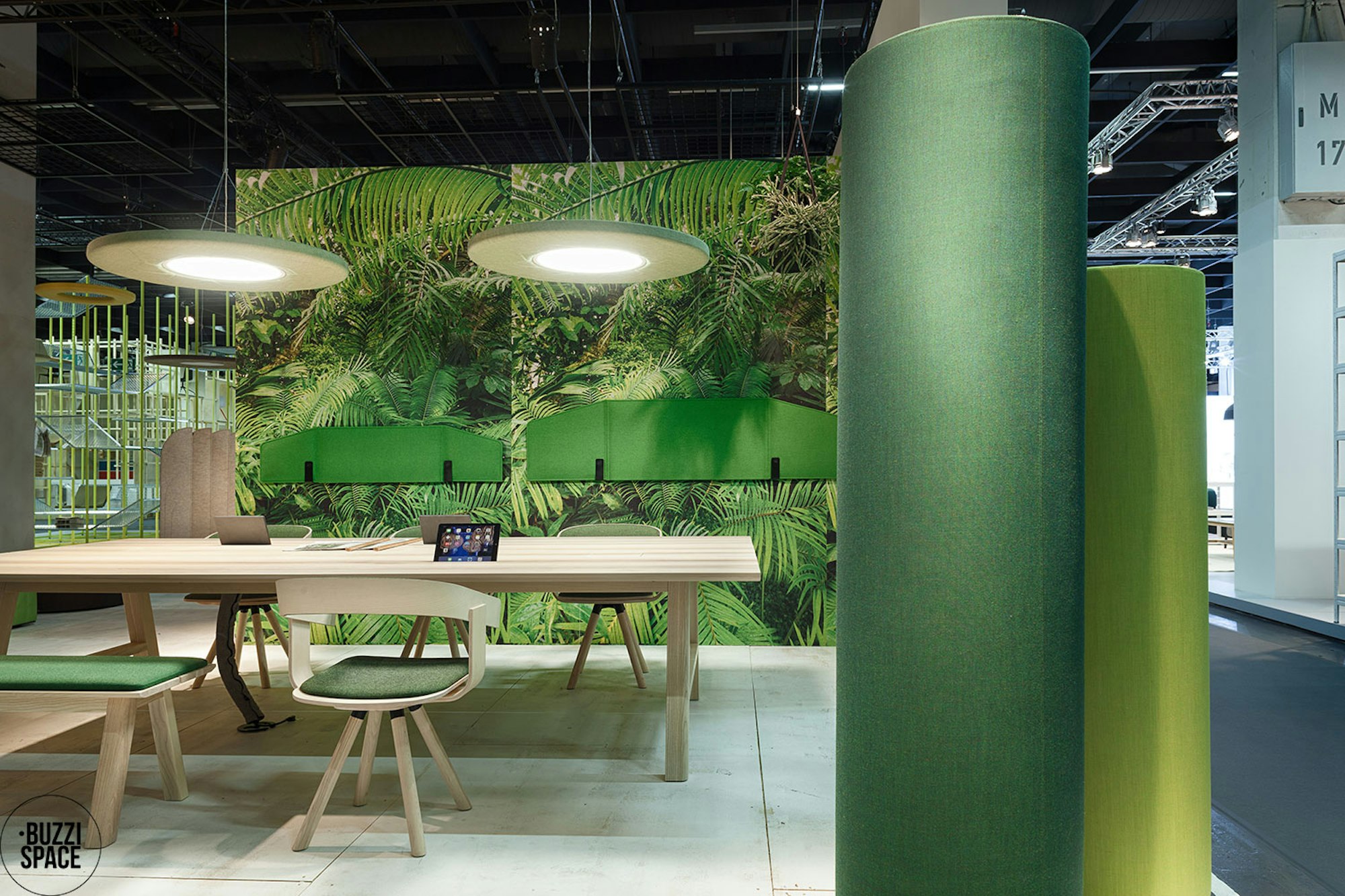 L'ajout de tons verts audacieux et de verdure ne nécessitant que peu d'entretien est l'étape la plus facile pour créer un environnement inspiré par la nature. BuzziMood, créé à partir de mousse de renne préservée, est une alternative parfaite aux solutions conventionnelles de contrôle du bruit. Cette option graphique favorise une atmosphère détendue et calme, quel que soit l'endroit où vous décidez de travailler.