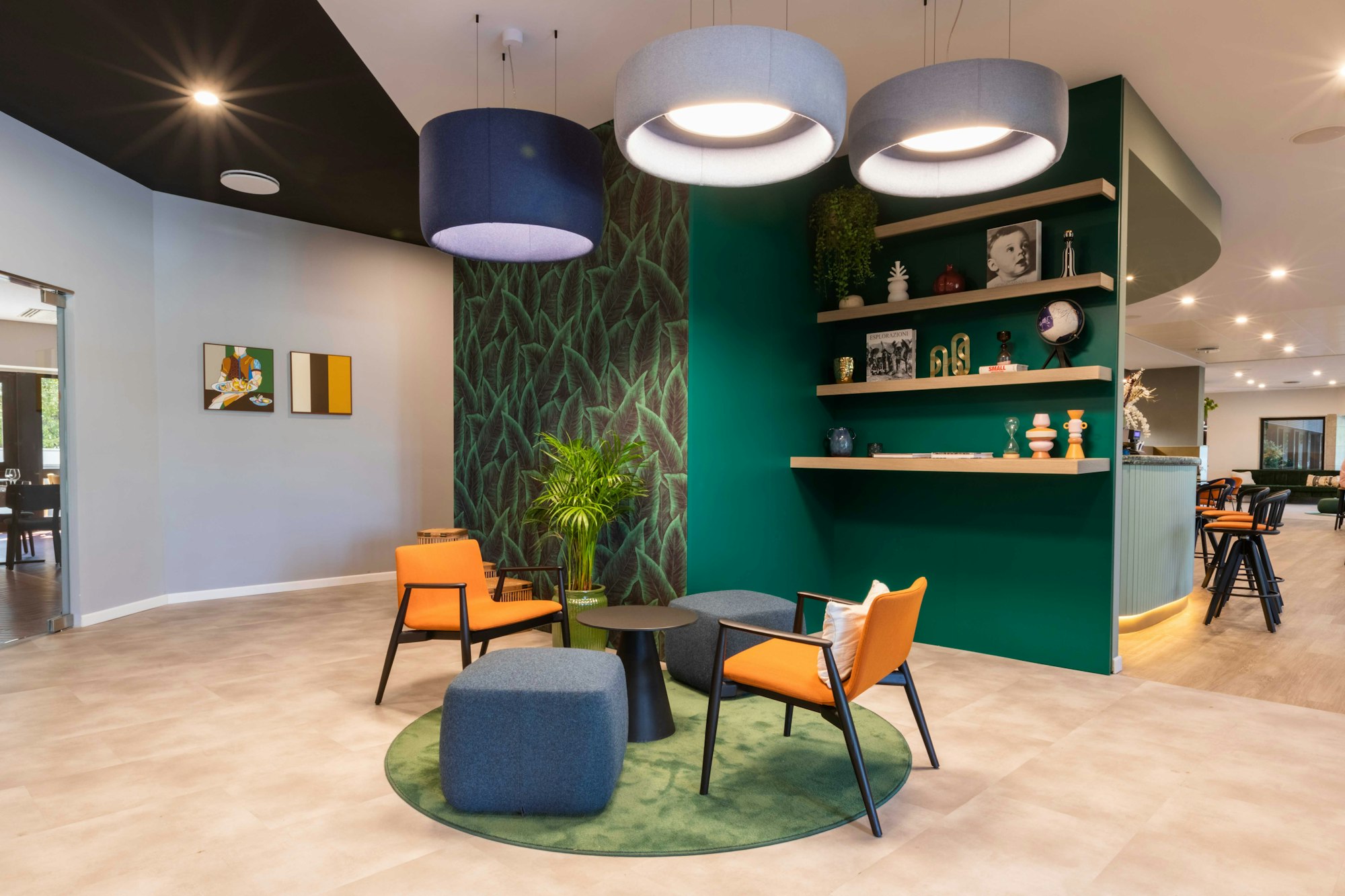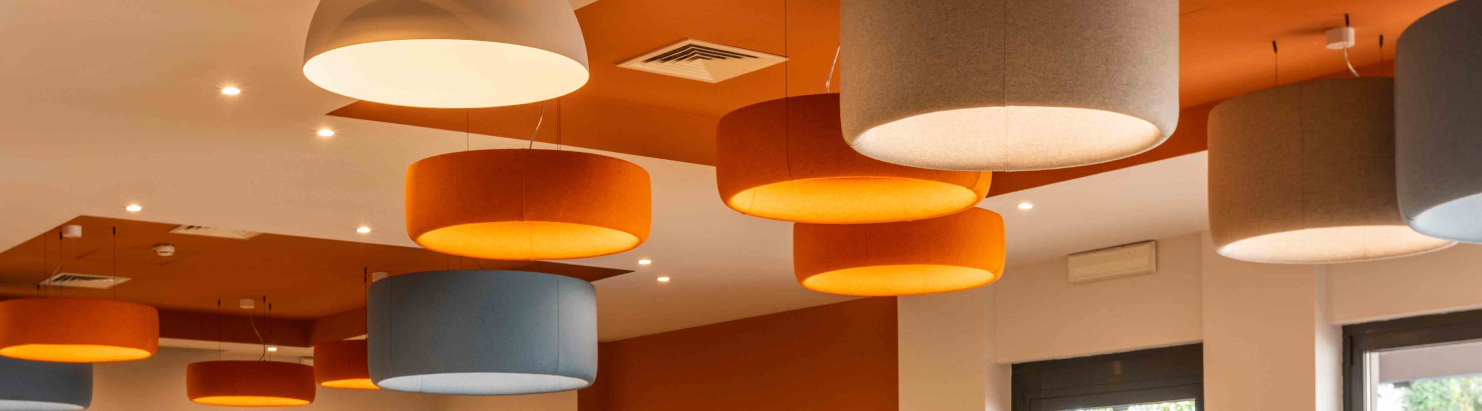 Nos solutions d'éclairage acoustique BuzziPleat Light et BuzziJet créent un espace accueillant pour les clients et les employés de l'hôtel.