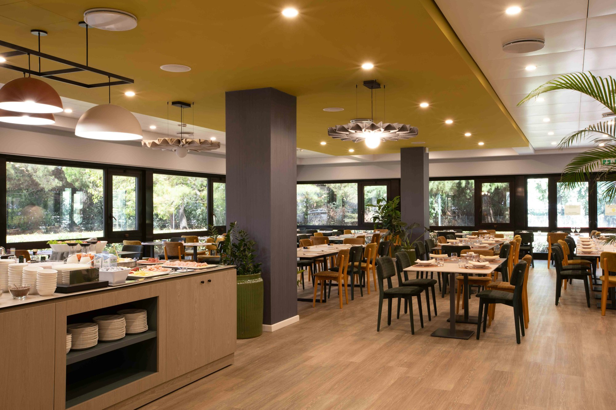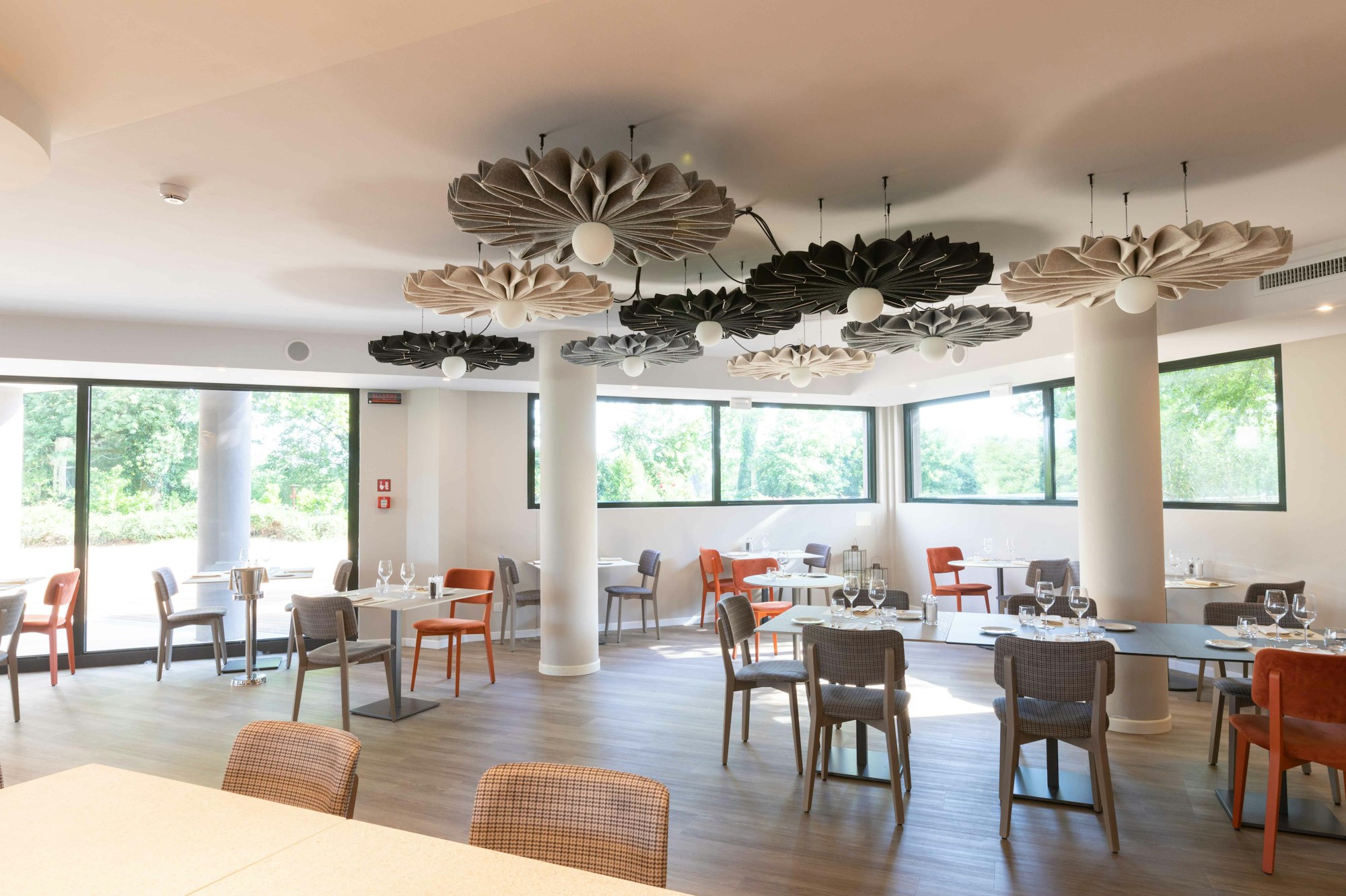 Les deux solutions d'éclairage acoustique susmentionnées ont également été installées dans les salles à manger et les restaurants. La forme sculpturale de BuzziPleat Light offre des capacités d'absorption acoustique à la fois innovantes et exceptionnelles pour que les clients puissent dîner dans le confort, tandis que le design luxuriant de BuzziJet contribue à atténuer les bruits excessifs.