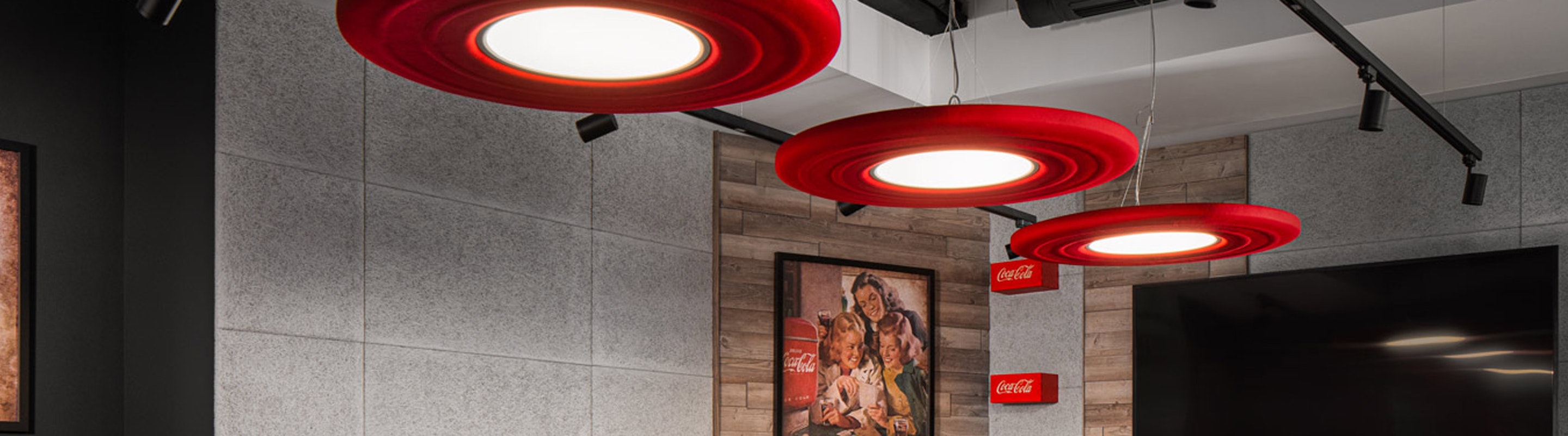Nous ne nous contentons pas de fournir des solutions fonctionnelles, nous offrons un large éventail de designs et d'options de personnalisation. Coca-Cola en a pleinement profité en habillant toutes les solutions d'éclairage de couleurs qui correspondent à l'identité de sa marque. Les rouges et les verts audacieux de Cola, ainsi que les jaunes soleil, contribuent à maintenir l'ambiance. Cette intégration transparente de la marque dans la décoration des bureaux améliore non seulement l'esthétique, mais renforce également l'identité de l'entreprise.