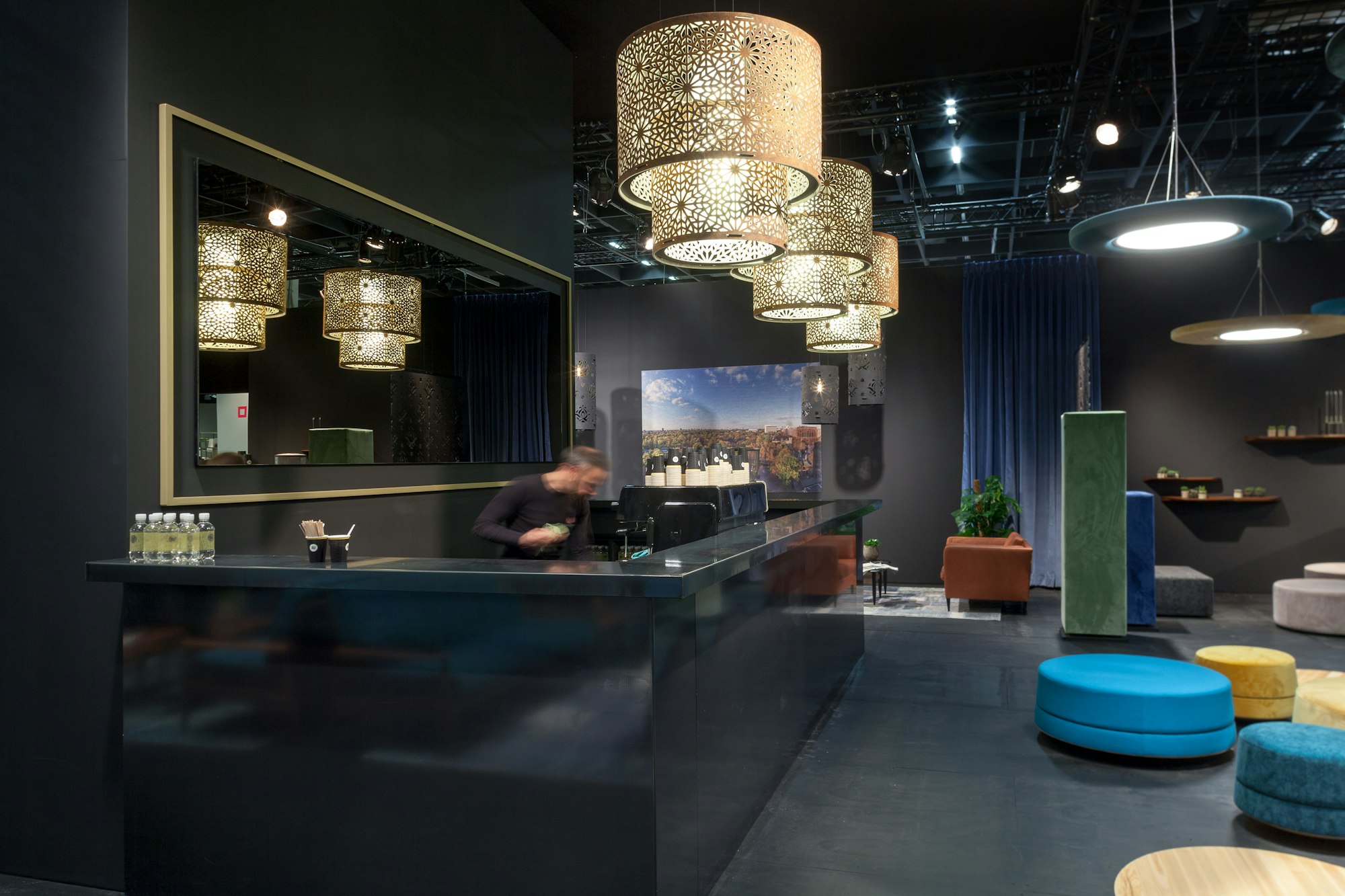 Le lustre BuzziChandelier ajoute de l'ambiance à votre pièce avec des ombres artistiques et des sons adoucis. Faites-vous remarquer et optez pour une version imprimée en Gold, Carrara et Emperador. Notre bar à Orgatec était éclairé par 3 BuzziChandeliers suspendus au plafond. Ils sont parfaits pour atténuer les sons aigus des personnes qui parlent et boivent.
