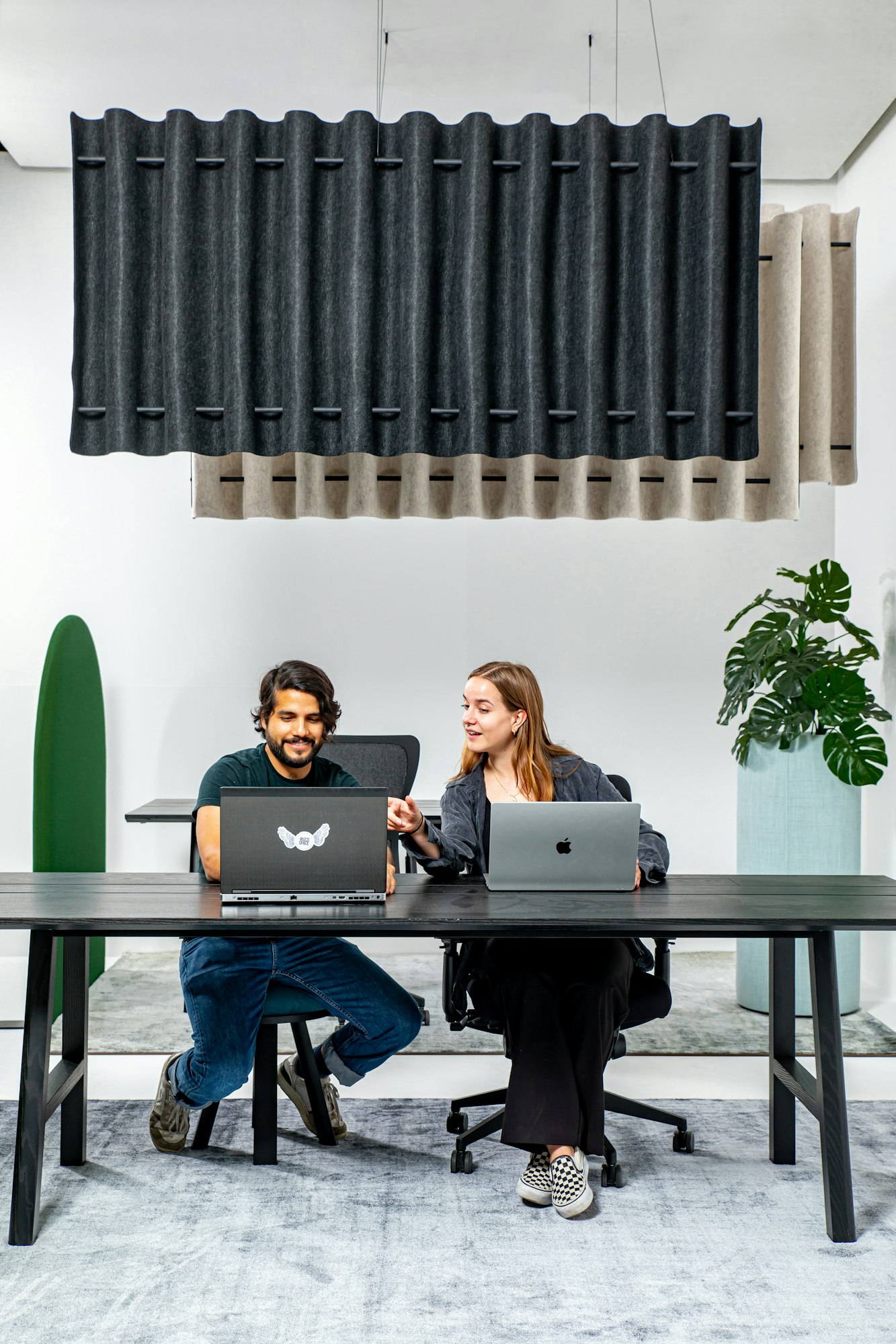 La solution acoustique peut être suspendue au plafond horizontalement ou verticalement. La première solution permet à BuzziFold d'agir comme un baffle classique, tandis que la seconde peut également contribuer à créer une intimité visuelle entre les postes de travail ou les différentes zones. BuzziFold est livré entièrement assemblé, ce qui en fait une solution acoustique facile à installer. Il est facile de combiner plusieurs BuzziFold pour créer un espace dynamique et unique. Une autre alternative consiste à fixer la solution au mur, ce qui permet d'alimenter la conversation.