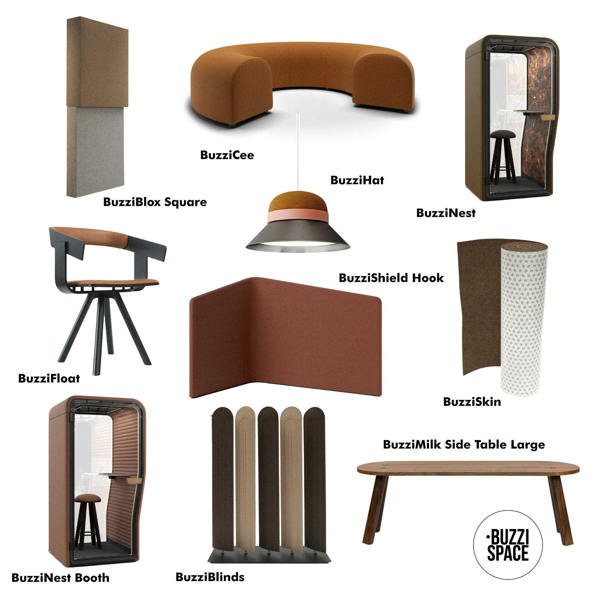 Présentés dans l'image ci-dessus : BuzziBlox, BuzziCee, BuzziNest, BuzziFloat, BuzziHat, BuzziShield Hook, BuzziSkin, BuzziBlinds & BuzziMilk Table.