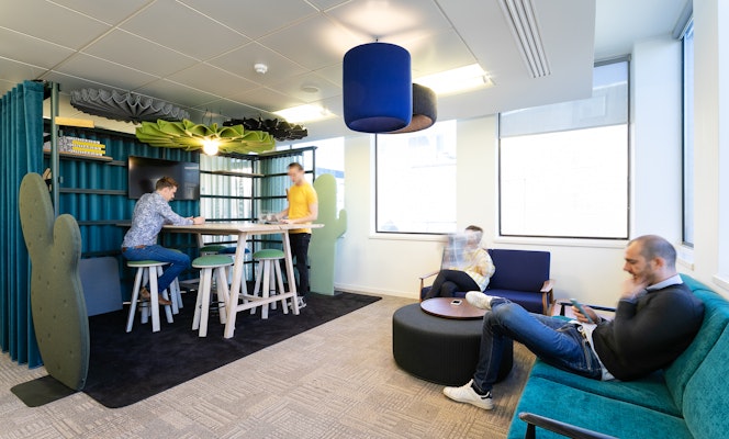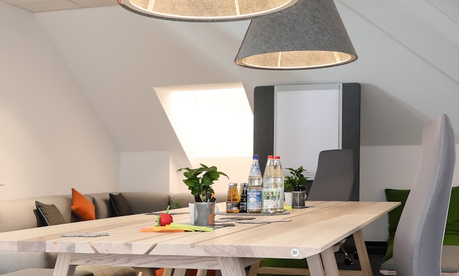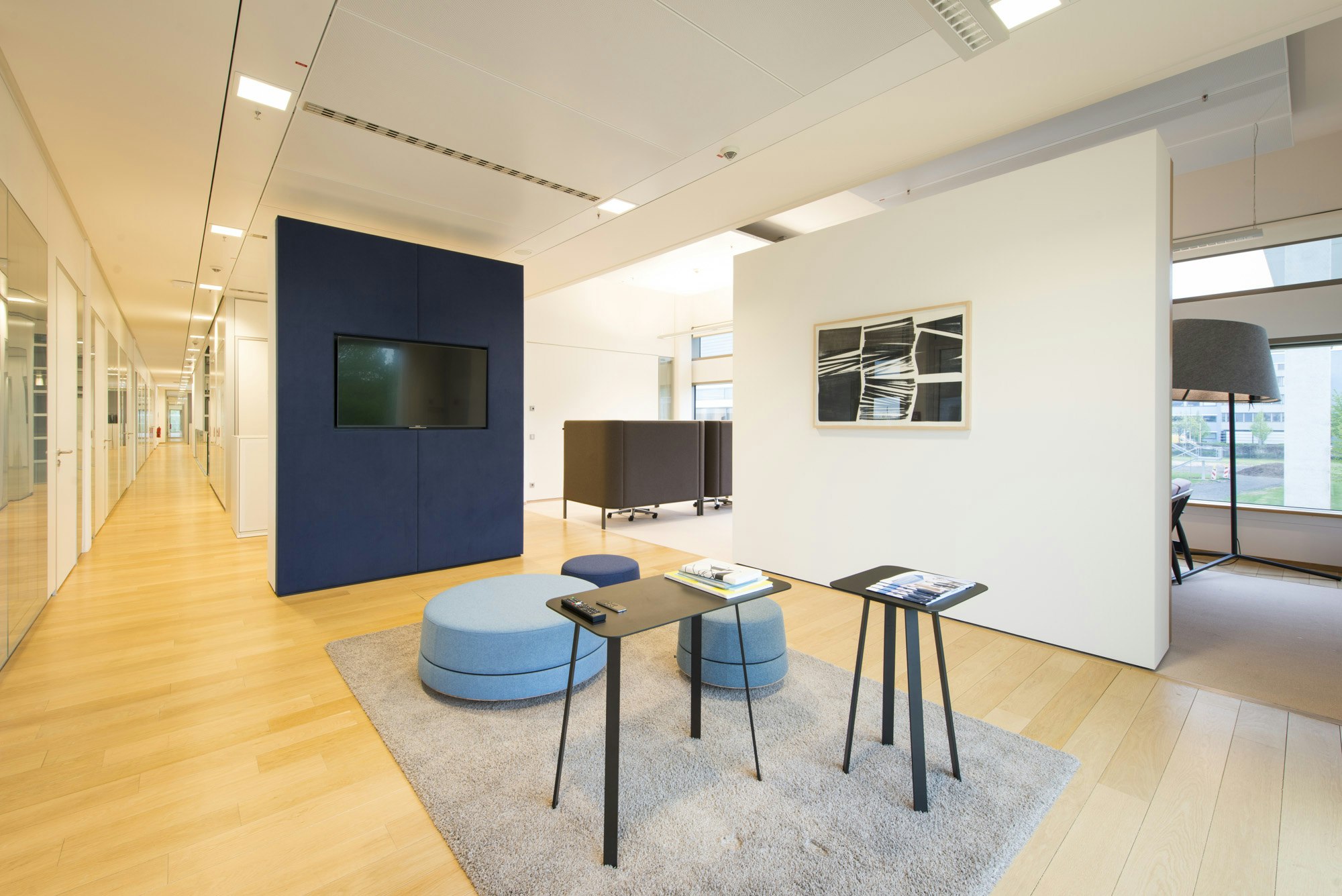 Cependant, repenser l'agencement de l'espace de travail ouvert pour définir des zones peut également impliquer des changements mineurs, par exemple en déplaçant les meubles, en utilisant des couleurs ou des cloisons et écrans flexibles pour délimiter les zones. Ci-dessus, des couleurs ont été utilisées pour délimiter une zone de réunion informelle avec BuzziBalance, tandis qu'à droite, un ensemble de BuzziHood dans des tons bleus a été choisi pour définir une zone pour les appels et les réunions individuelles. Dans l'espace ouvert ci-dessous, le canapé BuzziSpark donne l'illusion de murs avec son dossier haut, aidant ainsi à définir les zones.