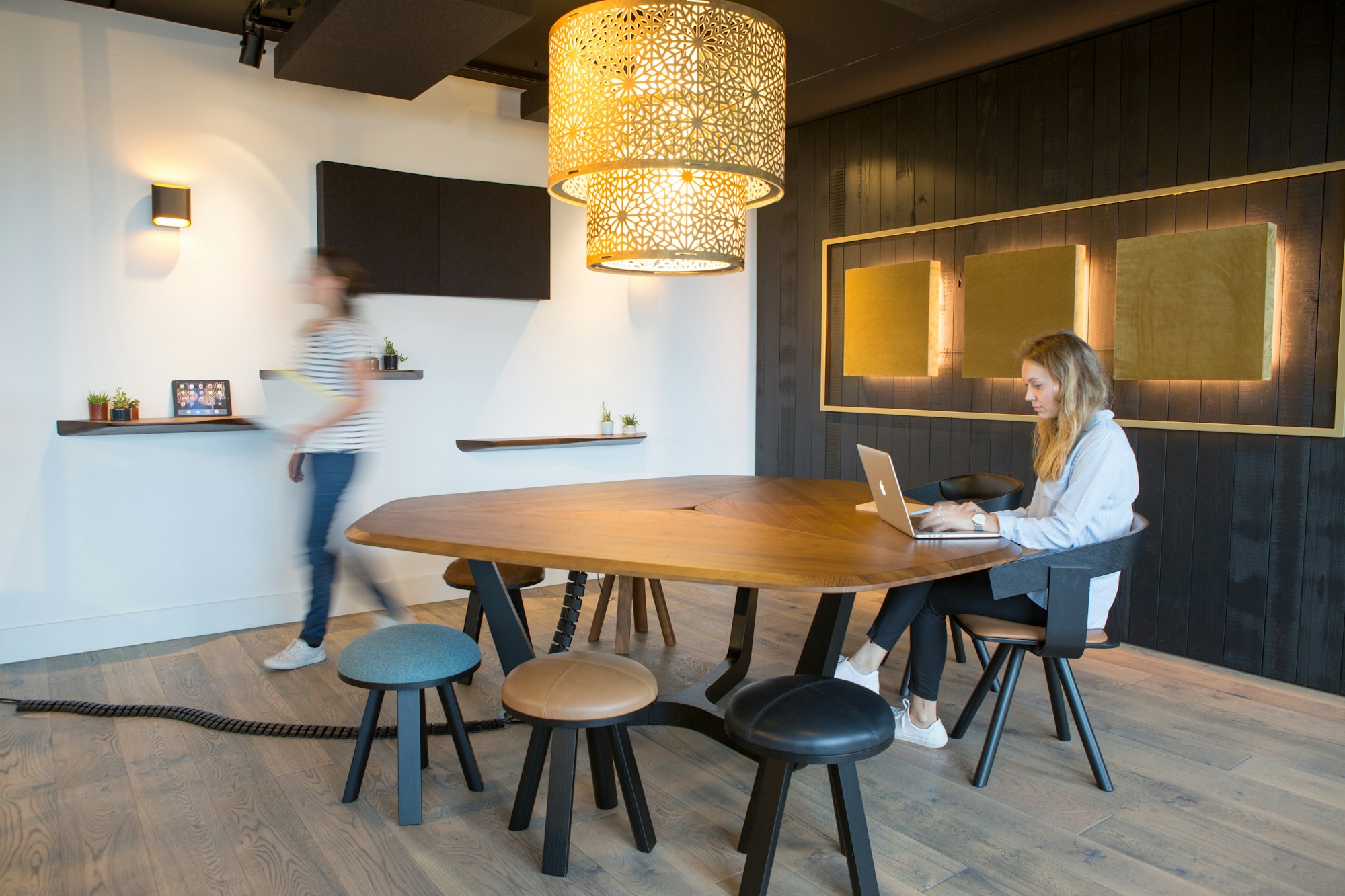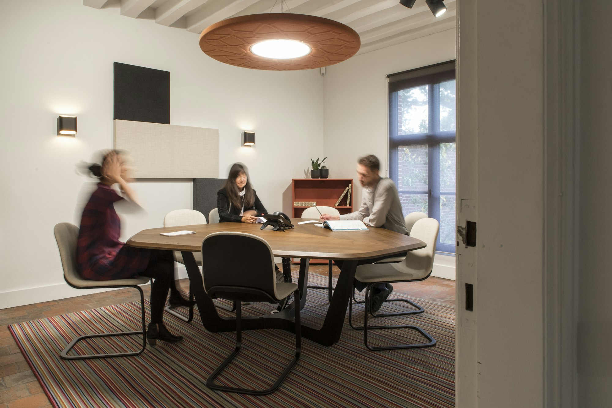 La salle de réunion ou la salle à manger est un exemple typique où le mobilier, l'éclairage et l'acoustique appropriés sont nécessaires pour rendre la conversation entre les participants ou les invités claire et agréable. Ici, les concepteurs ont opté pour un BuzziPicNic en bois noir combiné à plusieurs chaises BuzziFloat colorées pour ajouter de l'ambiance. Grâce au BuzziBell suspendu au plafond, cette salle de réunion est également bien équilibrée et assure une parfaite intelligibilité de la parole.