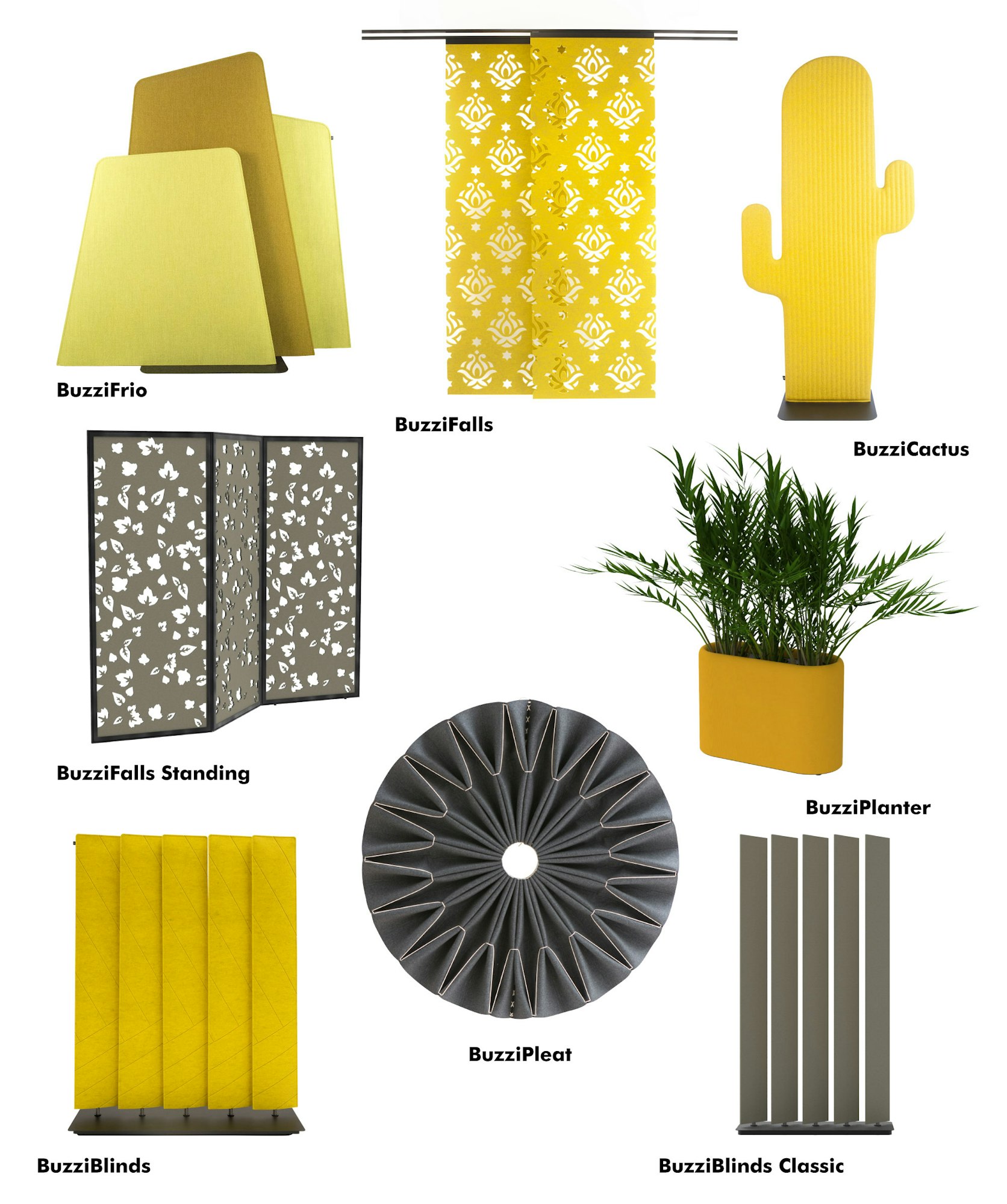 Showcased in the above image: BuzziFrio, BuzziFalls, BuzziCactus, BuzziFalls Standing, BuzziPlanter, BuzziPleat, BuzziBlinds, BuzziBlinds Classic.