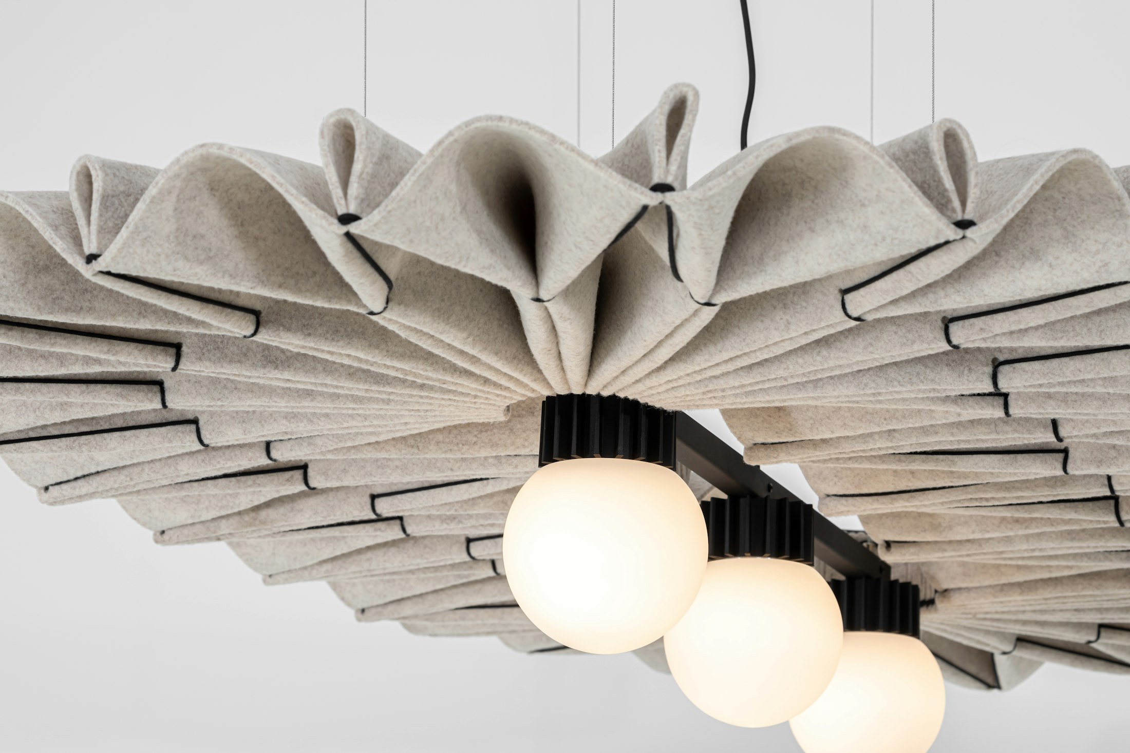 Finally, BuzziPleat Edel Long provides a shelter when suspended above a large communal table, creating a sense of togetherness. The new BuzziPleat Edel Long model can also be paired with BuzziSol Trio or BuzziSol Quintet in either a Globe or Spot iteration, also known as BuzziPleat Light Edel Long.