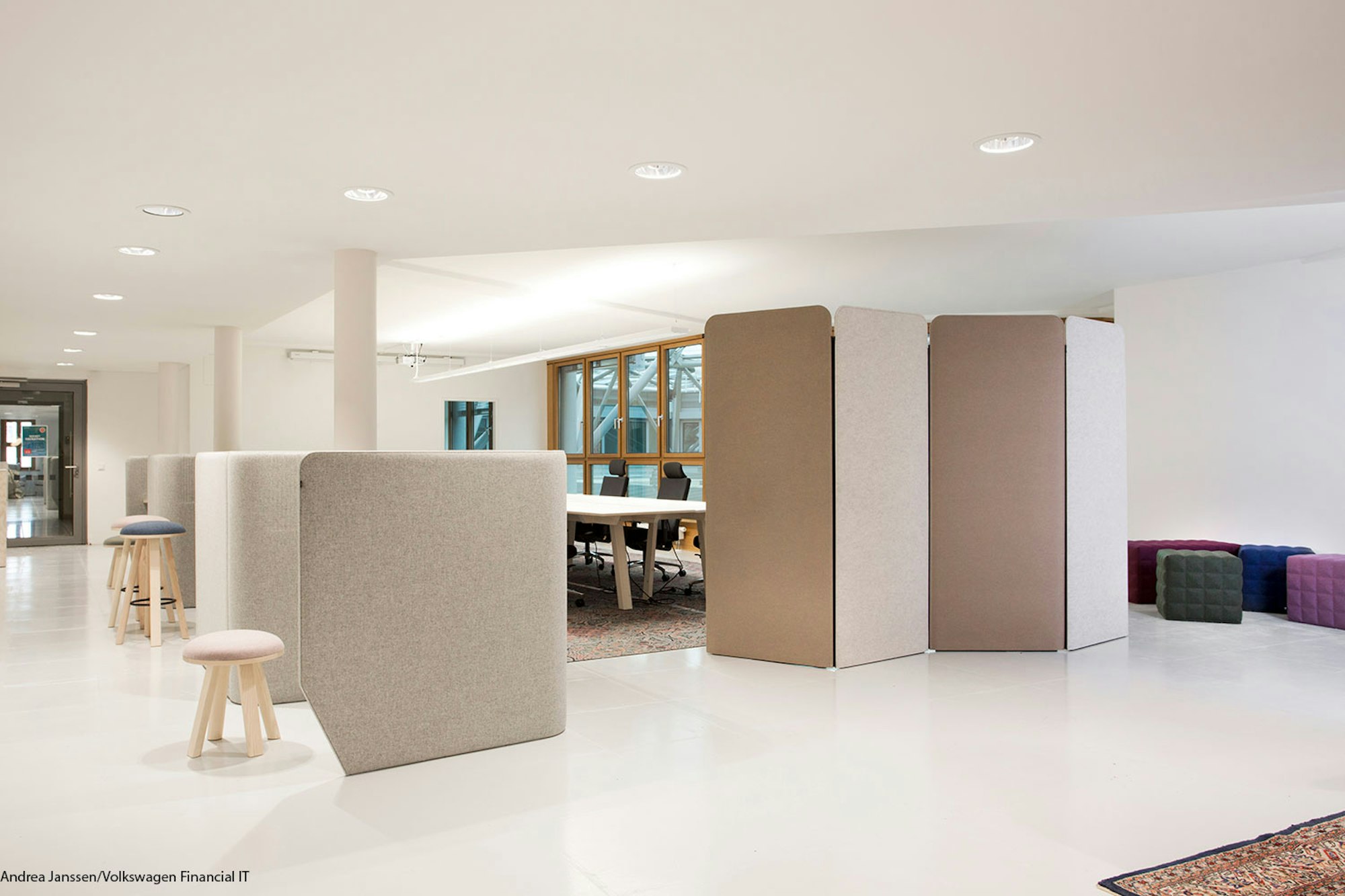Turning communal tables into individual and private workstations can also be achieved with BuzziDesk Cross and BuzziDesk FlipFlop. These flexible acoustic solutions are adjustable and can create varying degrees of privacy while defining multiple work areas.