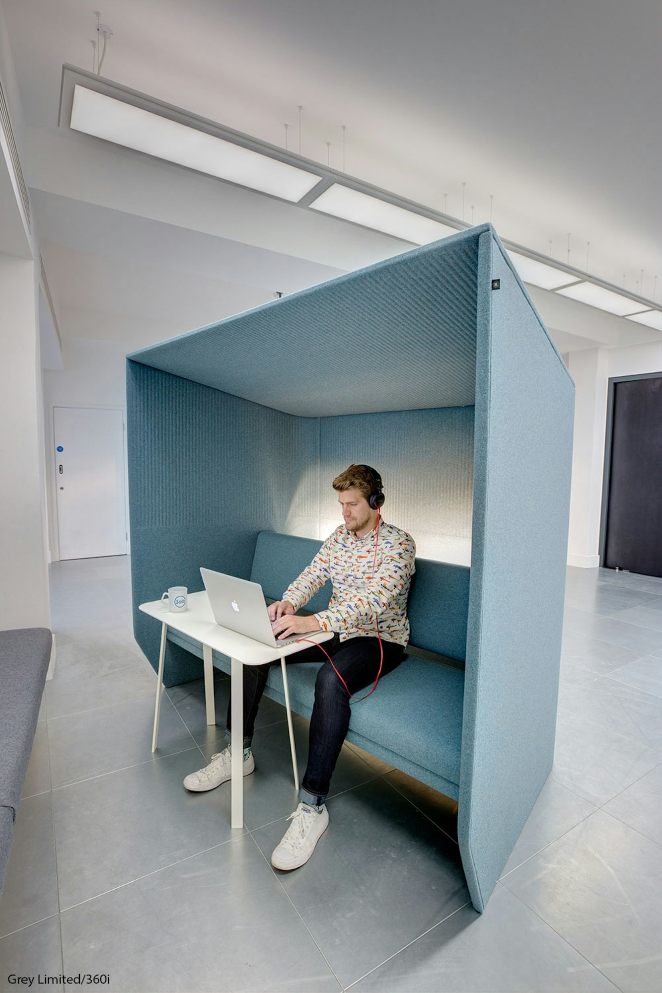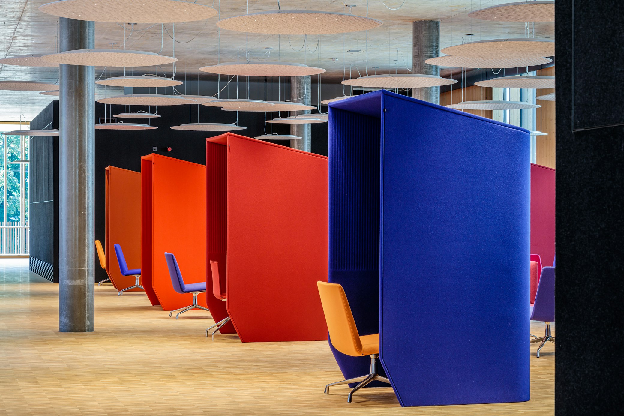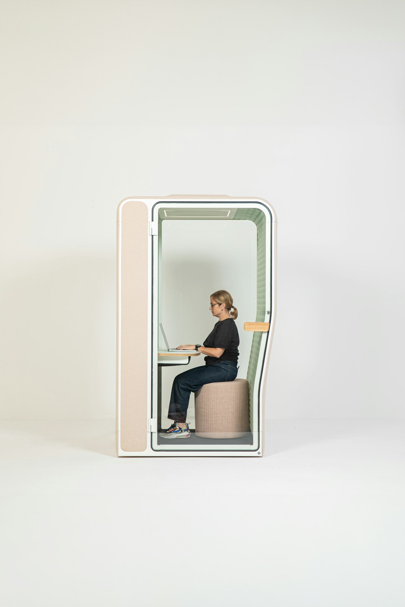 For open-space offices without acoustic treatment, a privacy booth can help absorb excess noise while additionally forming spots for work, meetings, and collaboration areas without having to build walls.