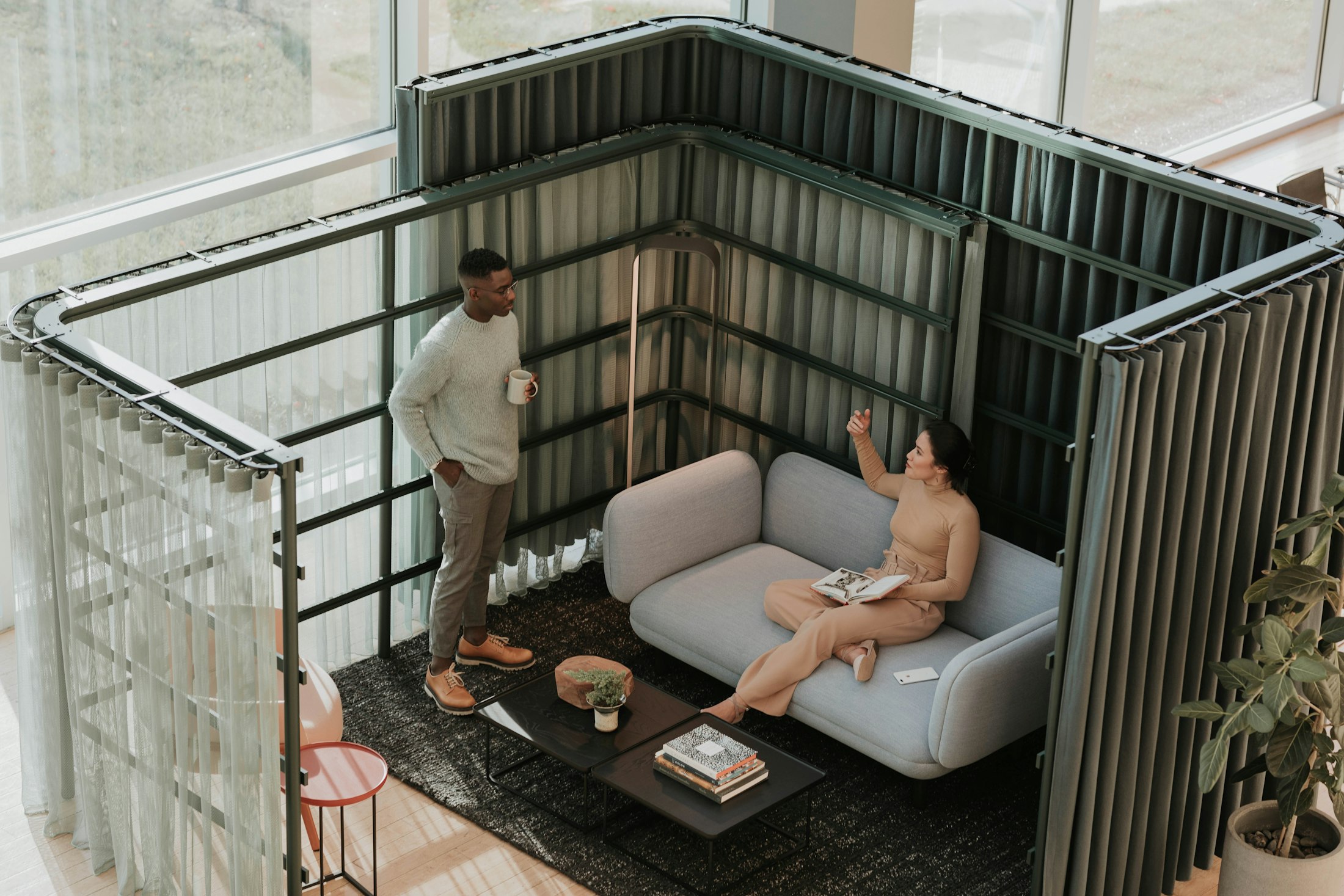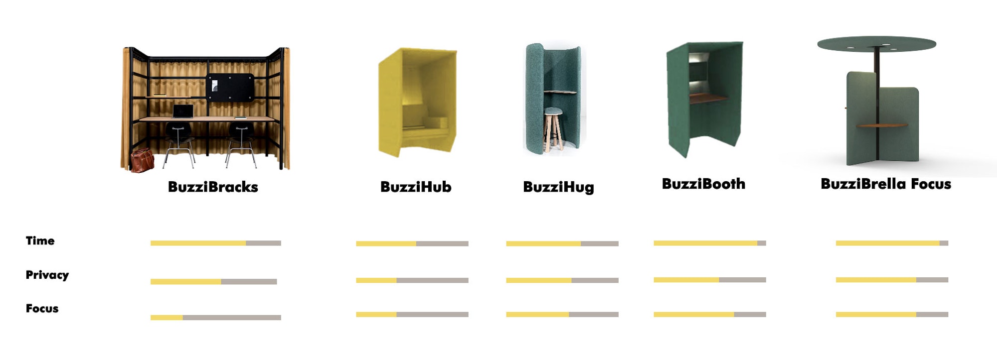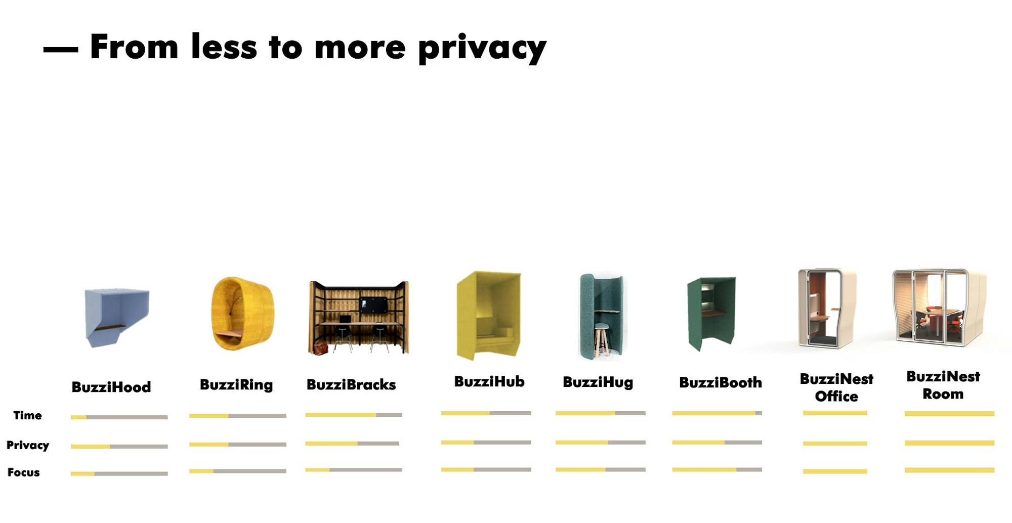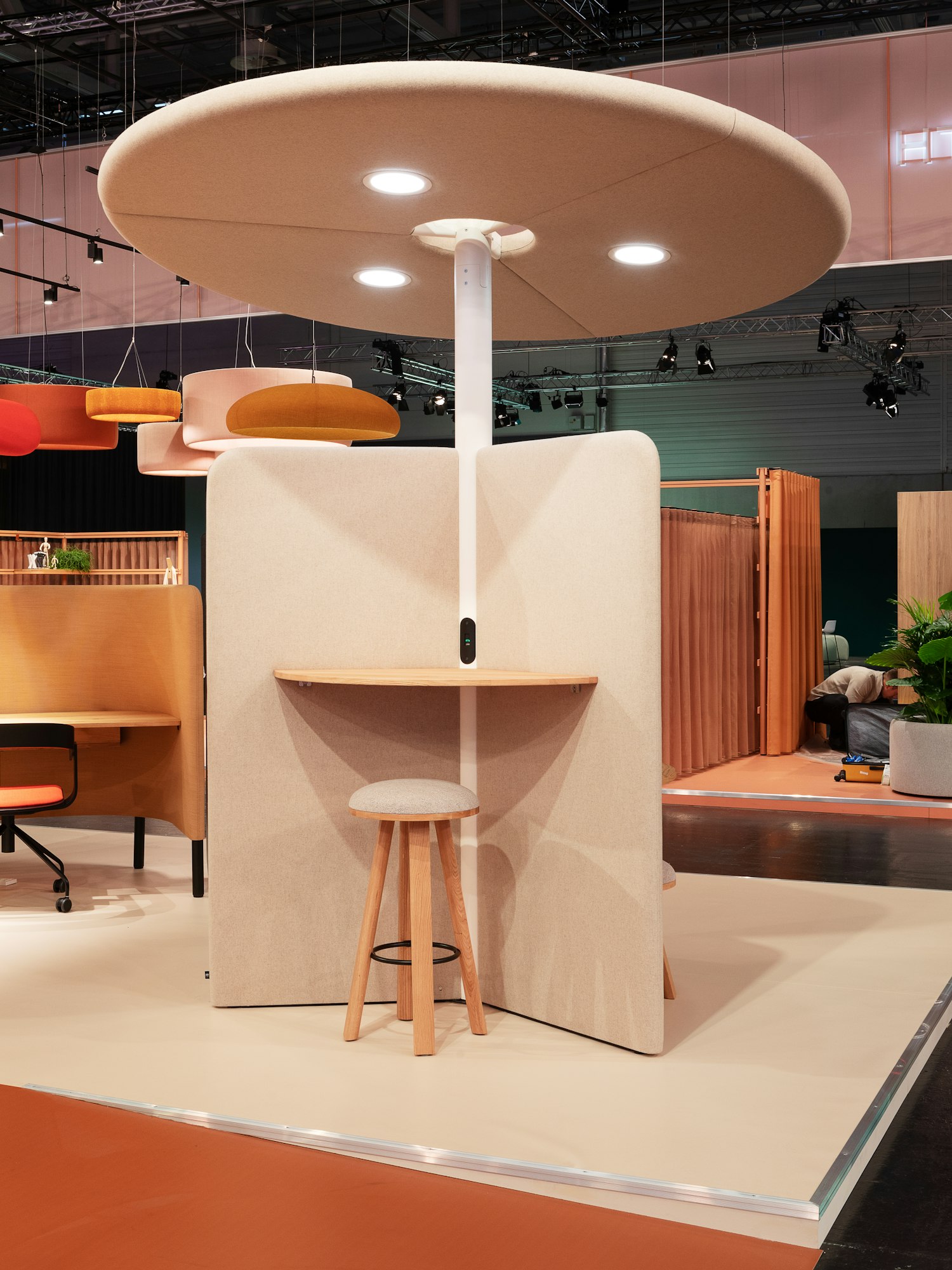 For open-space offices without acoustic treatment, a privacy booth can help absorb excess noise while additionally forming spots for work, meetings, and collaboration areas without having to build walls.