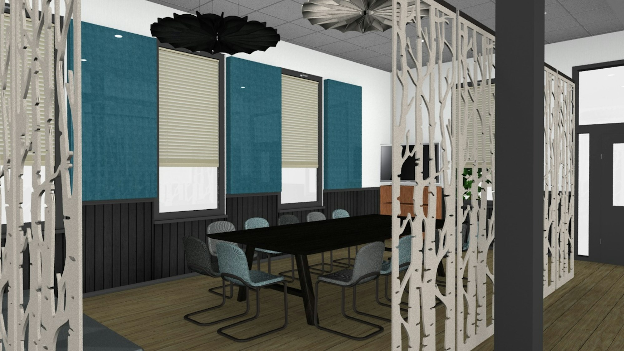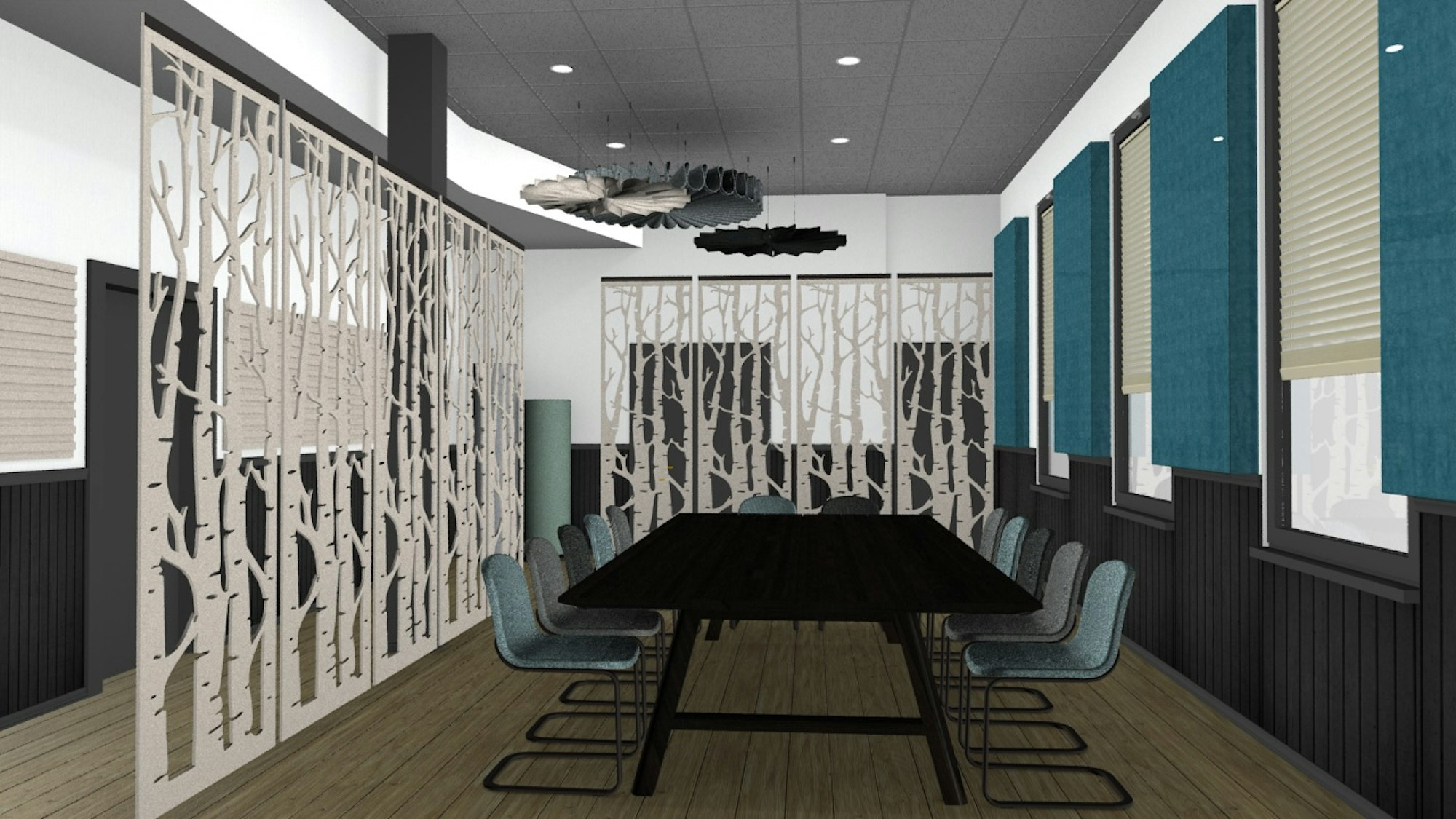 Remember, this is a meeting room and must be set up in the function of the space. It is already furnished with a conference table, but rather than keeping the wooden benches, we propose to replace these with more soft, porous furniture, e.g. chairs with a soft core. With an upholstered seat, BuzziBounce offers a comfortable seating experience while absorbing excess noise.